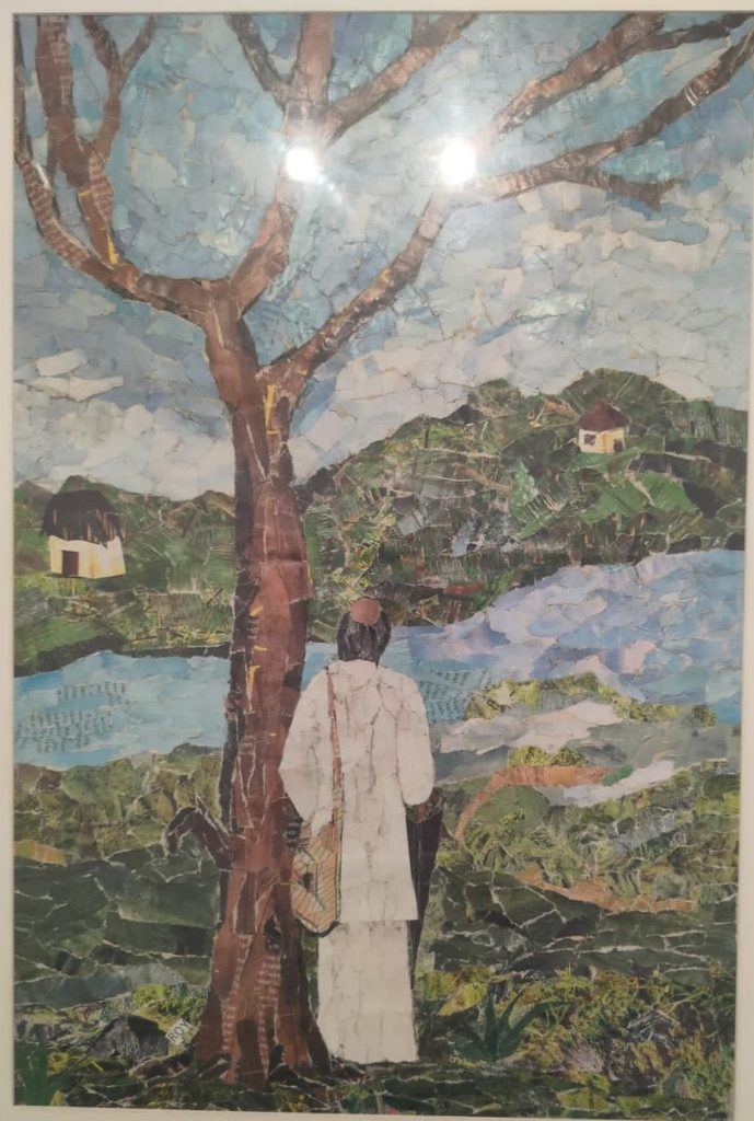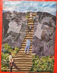 പ്രദർശനത്തിലെ രണ്ടു ഡസനിലേറെ കൃതികളിൽ രചനാവൈഭവംകൊണ്ട് പ്രത്യേകം ശ്രദ്ധേയമാണ് കുറച്ചു ചെറുപ്പക്കാർ ഒരു കുന്നിന്റെ പടവുകളിൽ കയറുന്നത്. പടവുകൾക്ക് ഇരുവശവും പാറക്കെട്ടുകൾ. അവയുടെ താഴവാരത്ത് പൂത്തുല്ലസിച്ച് കുറ്റിക്കാട്. കാലങ്ങളായി മനുഷ്യർ കയറിയിറങ്ങി സ്വരൂപമാർജിച്ചതെന്നു വിഭാവനം ചെയ്യപ്പെടുന്ന ആ പടവുകൾ കലാകാരൻ ഒരുക്കിയിരിക്കുന്നത് പാക്കേജിങ്ങിനുപയോഗിക്കുന്ന ചുളുക്കുകളുള്ള കട്ടികുറഞ്ഞ കാർഡ്ബോർഡ് പോലുള്ള വസ്തു ഉപയോഗിച്ചാണ്. കൊളാഷ് കലാകാരന്റെ വസ്തു ശേഖരത്തിലല്ലെങ്കിൽ വെയിസ്റ്റ് ബാസ്കറ്റിൽ കിടക്കേണ്ട അവശിഷ്ടമാണത്. പ്രദർശനത്തിലെ കലാസൃഷ്ടികൾക്കു പിന്നിലുടനീളം ഈ മൗലിക പ്രതിഭയുടെ വിളയാട്ടം കാണാം.